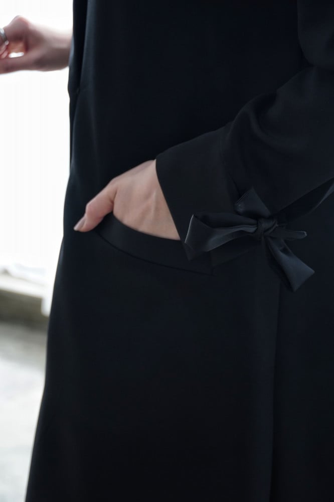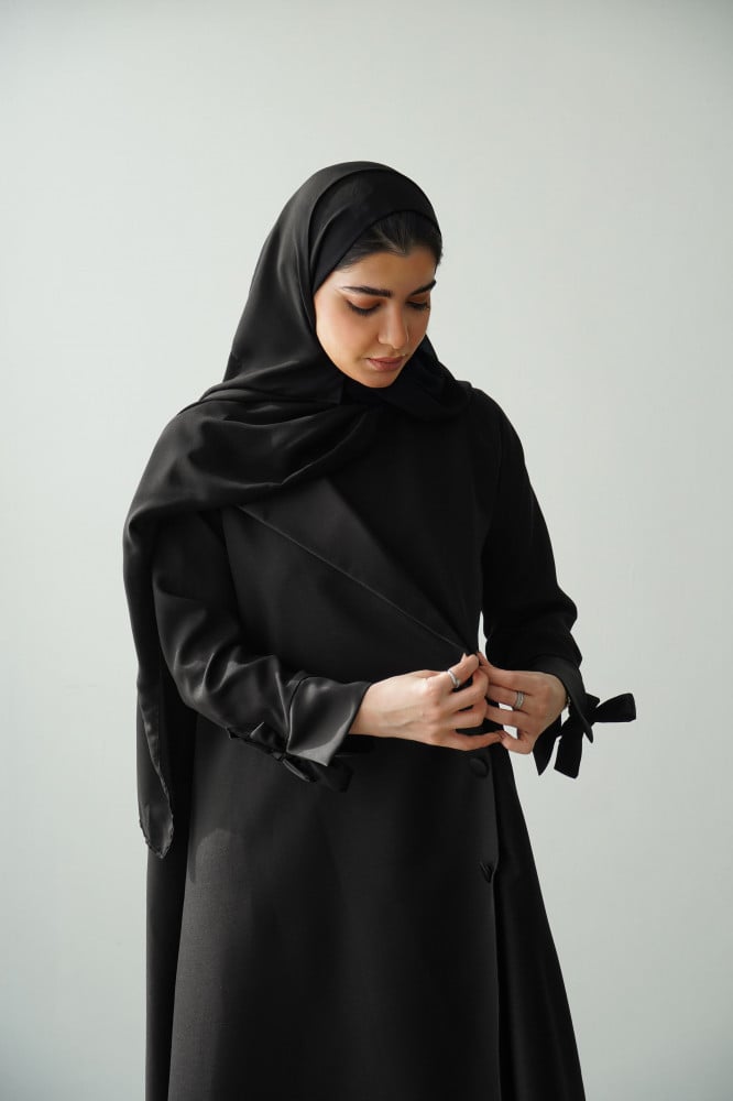 - عباية لف من خامة كريب كتان الخفيف والتفتة ، بياقة واحدة مع طقطق مخفي من الداخل وجيب جانبي.