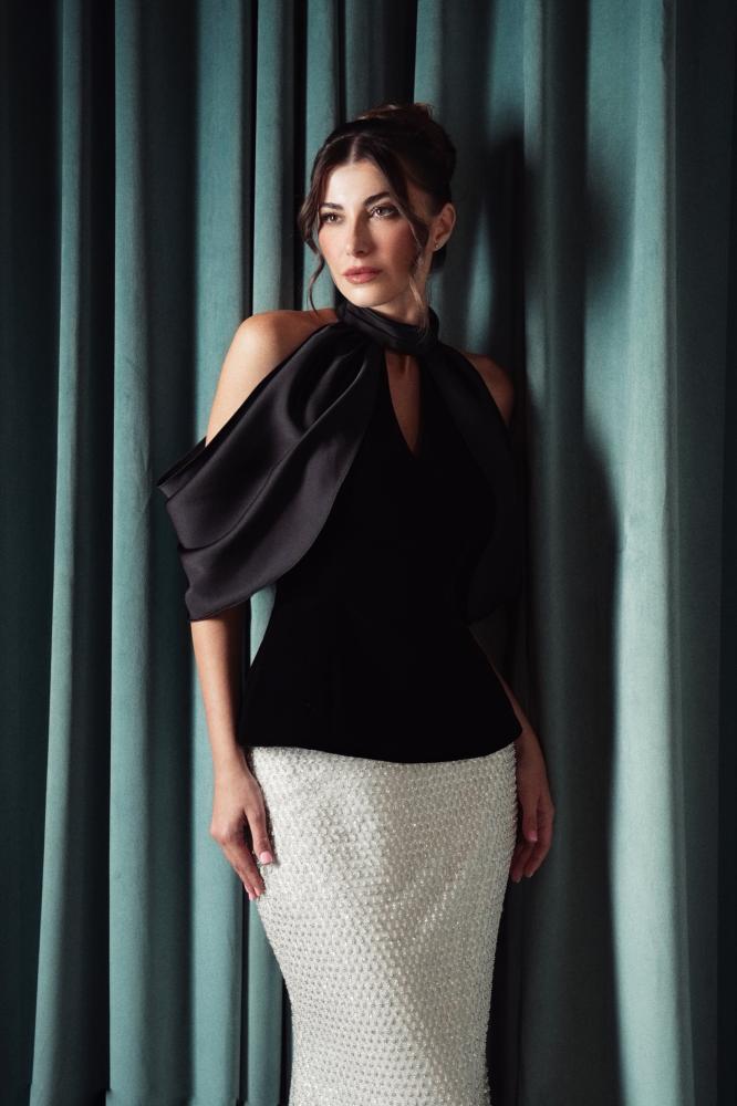 - ألوان أنيقة: تتميز البلوزة باللون الأسود الذي يرمز إلى الأناقة دون أي إضافات، ومعها تنورة فضيّة اللون، وهو مزيج ألوان يُنتج إطلالة فريدة من نوعها.