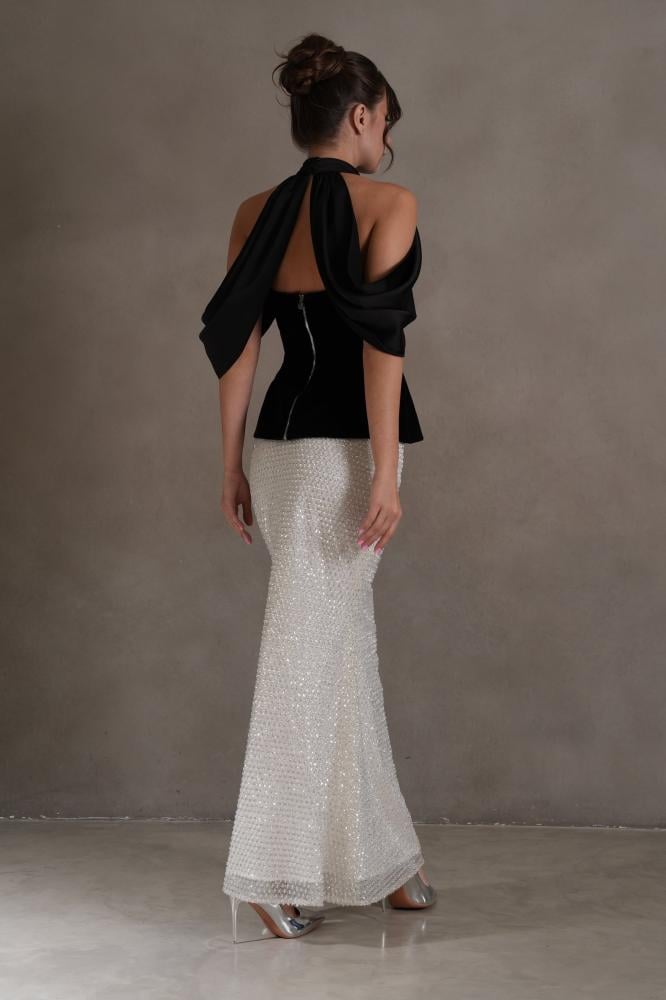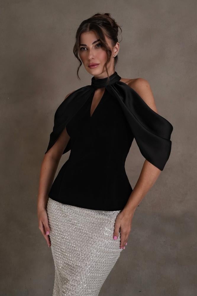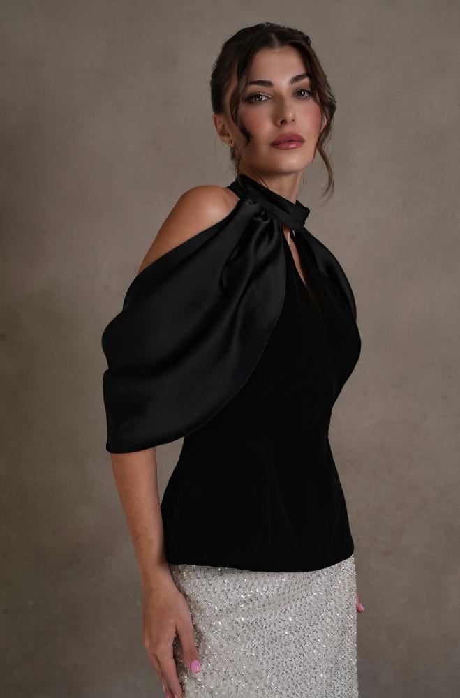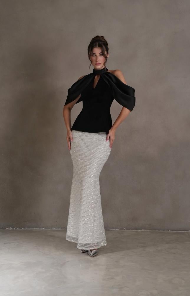 يُعرف اللون الأسود بأنه رمز الأناقة والجاذبية، لا سيّما في أطقم السهرة الراقية، احصلي الآن على بلوزة مخمل اسود بتصميم ناعم يجمع بين الأناقة والعصرية، مع تنورة مصنوعة من التل شك خرز باللون الفضي، مما يضمن لكِ إطلالة ناعمة وجذابة في مناسباتك القادمة.