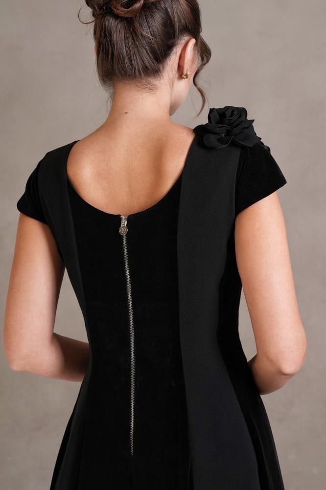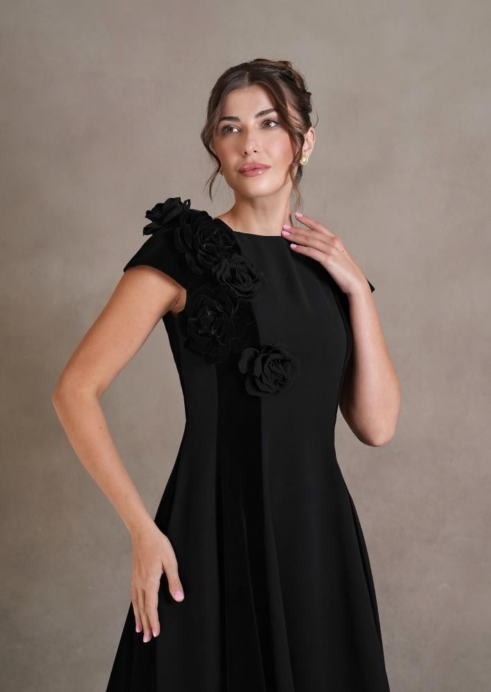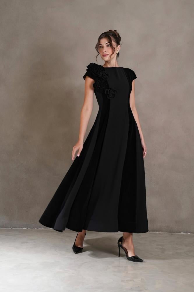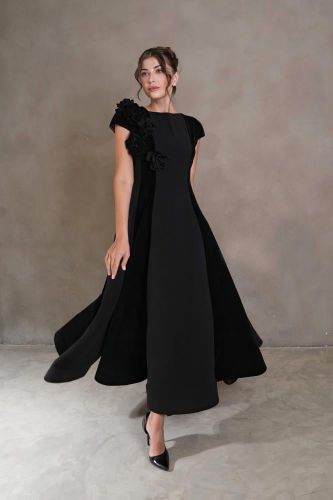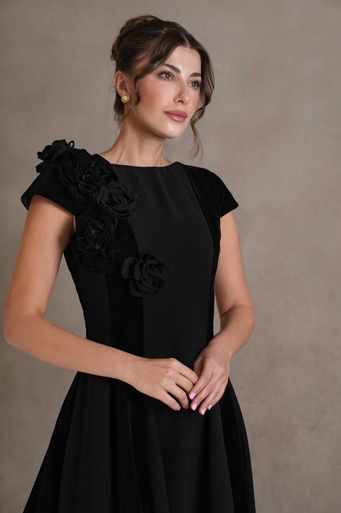 - لون أنيق: يُعرف اللون الأسود بأنه رمز للأناقة والجاذبية، وقد تميّز الفستان باللون الأسود السادة مع مراعاة دمج خامتين مختلفتين.