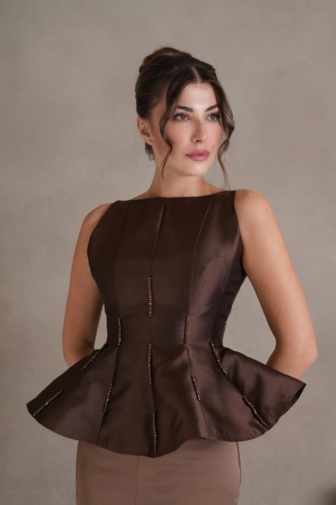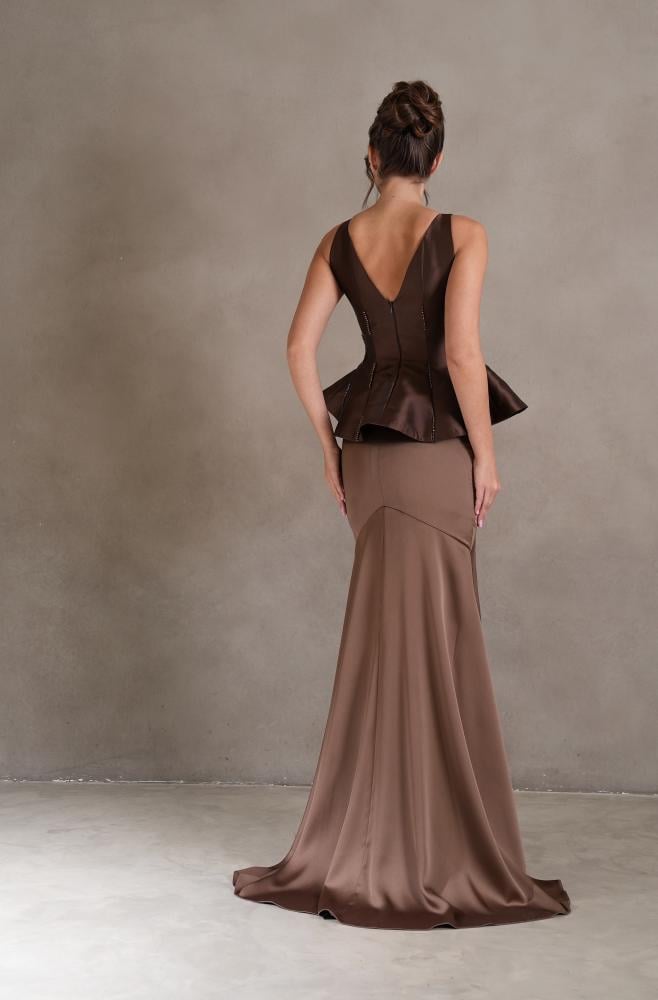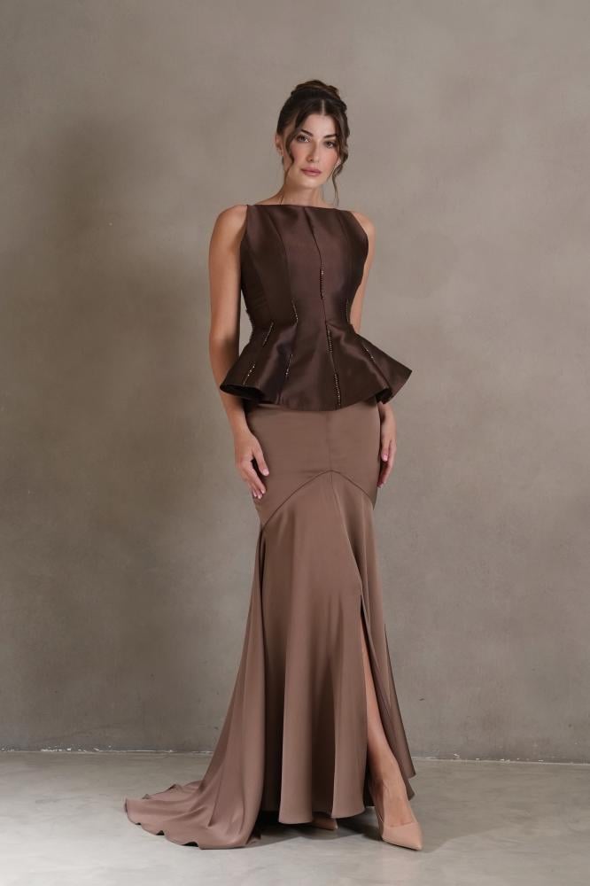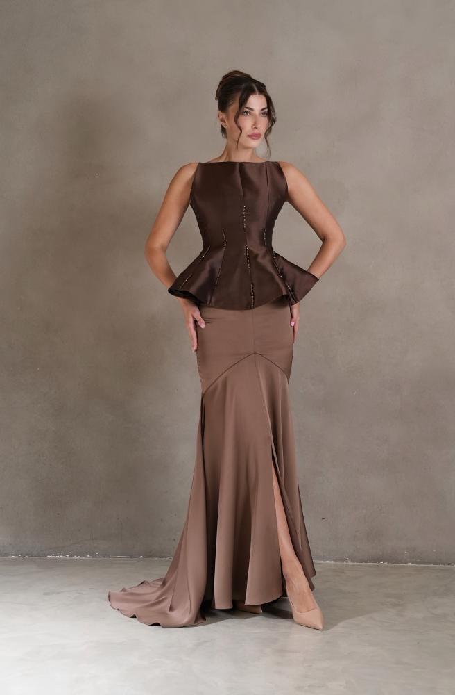 اشتري الآن طقم تنورة وبلوزة سهرة يعزز من جاذبية إطلالتك في مناسباتك القادمة، يتكون من بلوزة باللون البني الداكن بدون أكمام تغطي منطقة الصدر كاملةً، مع فتحة على شكل حرف V في منطقة الظهر، وتصميم مميز في الجزء السفلي، مع تنورة طويلة باللون الترابي بتصميم ضيق من الأعلى واسع من الأسفل، وفتحة بدايةً من الركبة إلى أسفل.