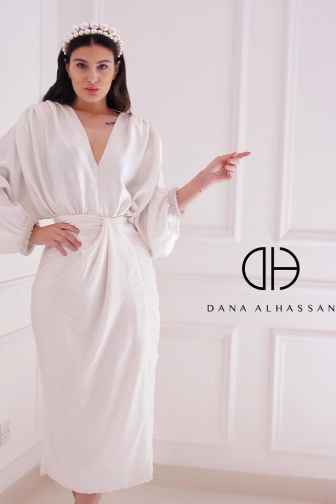 فستان من خامة الكريب ستان و المخمل الفرنسي مع شك على أساور الكم.