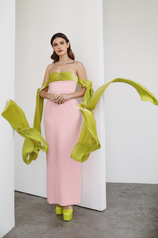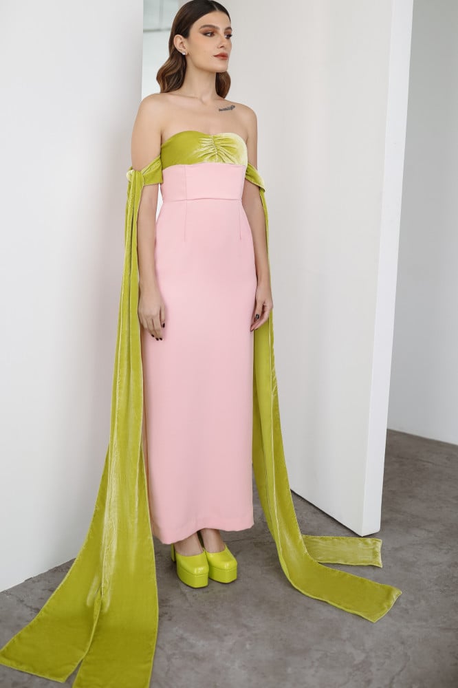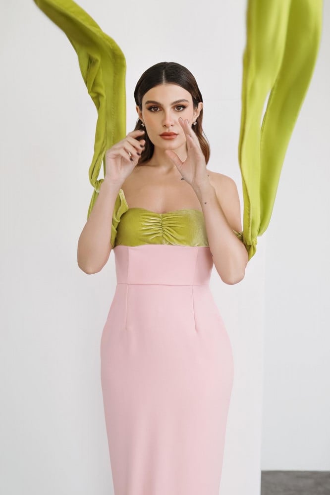 فستان من المخمل التفاحي و الكريب باللون الزهري باكمام ربط.تفصيل حسب الطلب.مدة التنفيذ 7 - 10 أيام عمل.