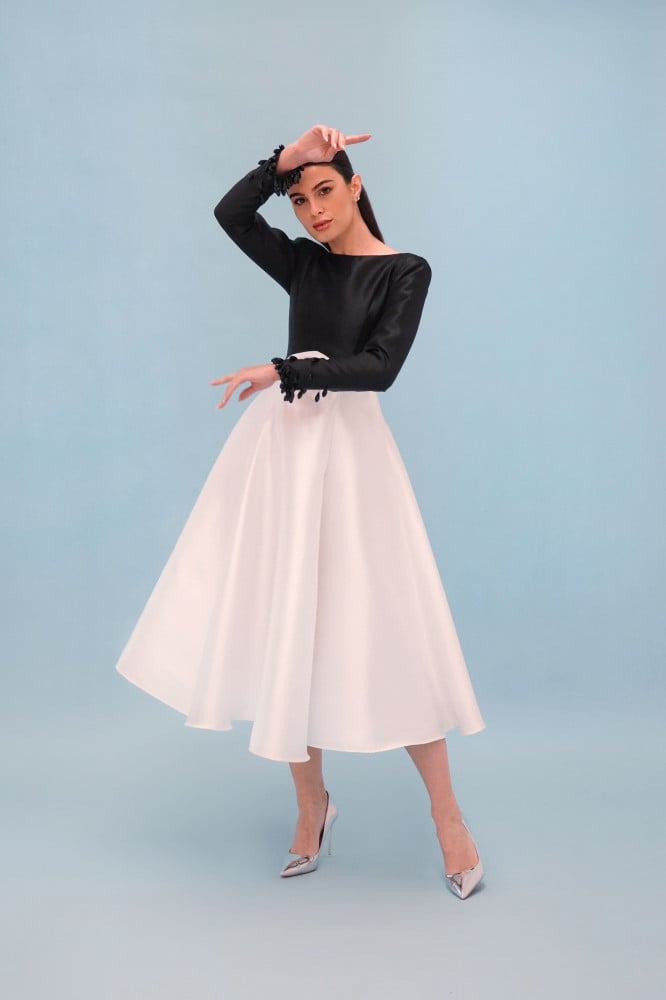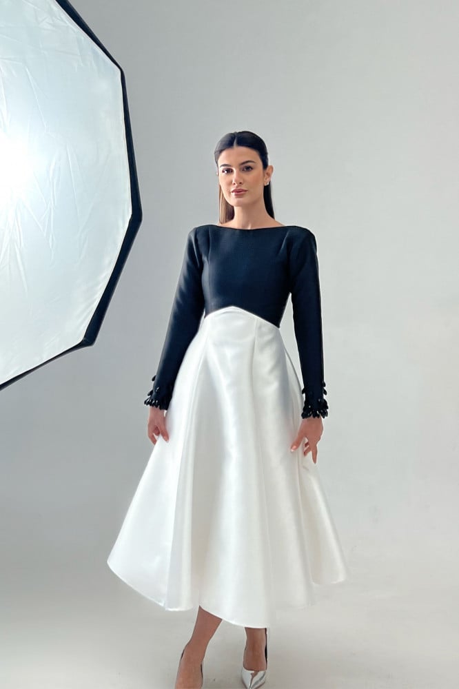 فستان من التفتة باللون الأسود والأبيض مع ظهر مفتوح ، وكريستال على الأكمام.تفصيل حسب الطلب.مدة التنفيذ 7-20 يوم عمل.