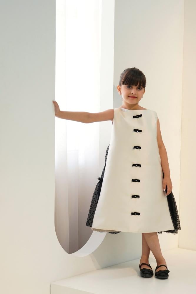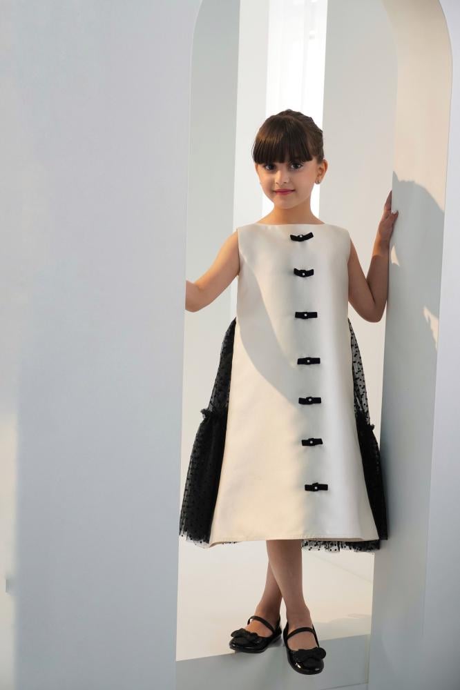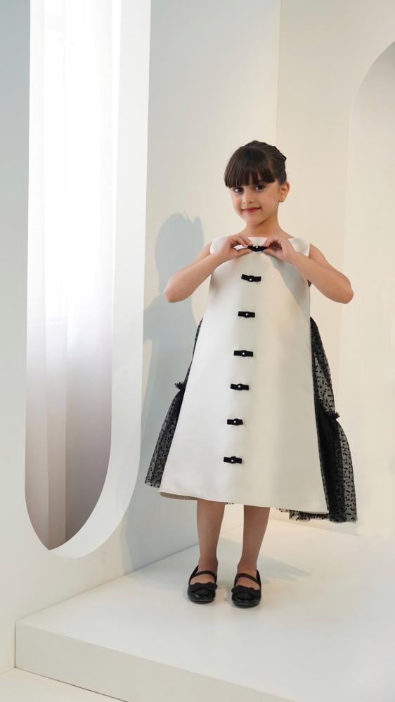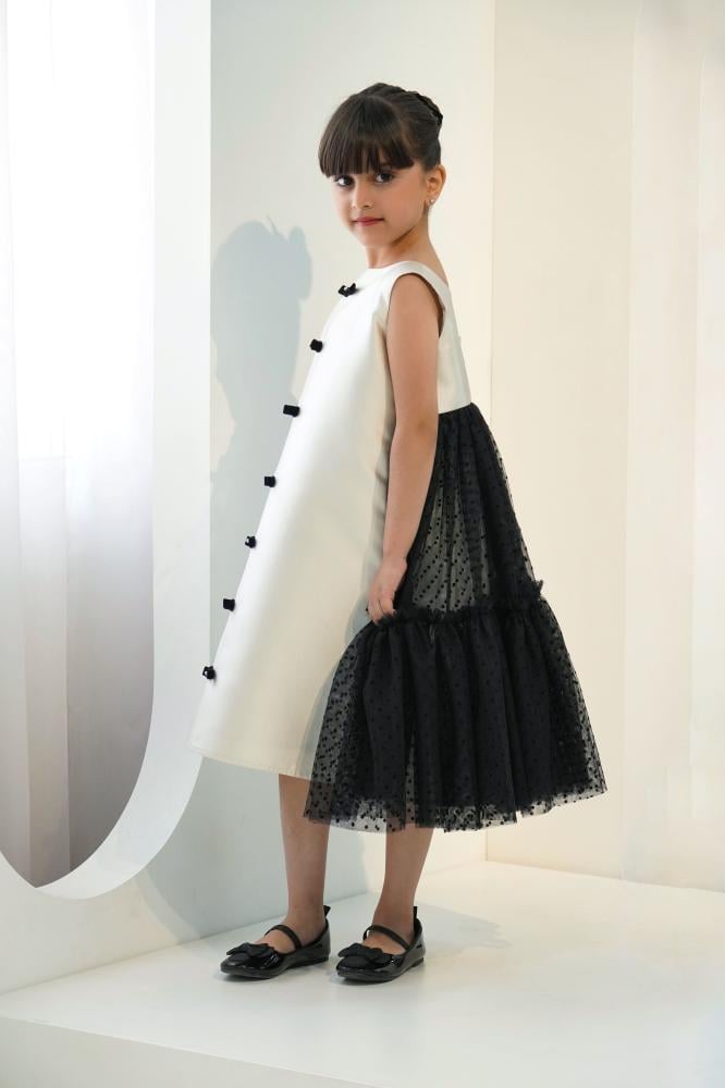 لأن الأمهات دائمًا ما يرغبنّ في شراء الملابس التي تُظهر طفلاتهنّ بأفضل إطلالة ناعمة ورقيقة، وفرنا لكِ فستان بناتي سهرة يُمكنك شراؤه لطفلتك لحضور المناسبة القادمة بأفضل مظهر، ومميز بلونه الأبيض مطرزًا بربطات سوداء صناعة يدوية مزيّنة بالكريستال على منطقة الصدر، مع طبقات من التُل الأسود المنقط لتزيين الجزء الخلفي من الفستان.