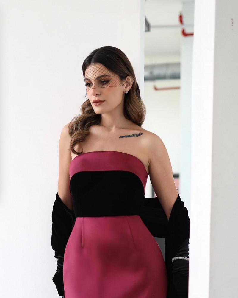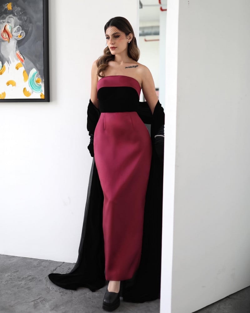 This strapless evening dress is your perfect choice for a sophisticated and attractive look for your next occasion, especially since it is made of berry taffeta and black velvet, an elegant color combination for a soft look. You can add your own touch to the look by wearing black gloves that reach up to the elbow. Buy the dress now from