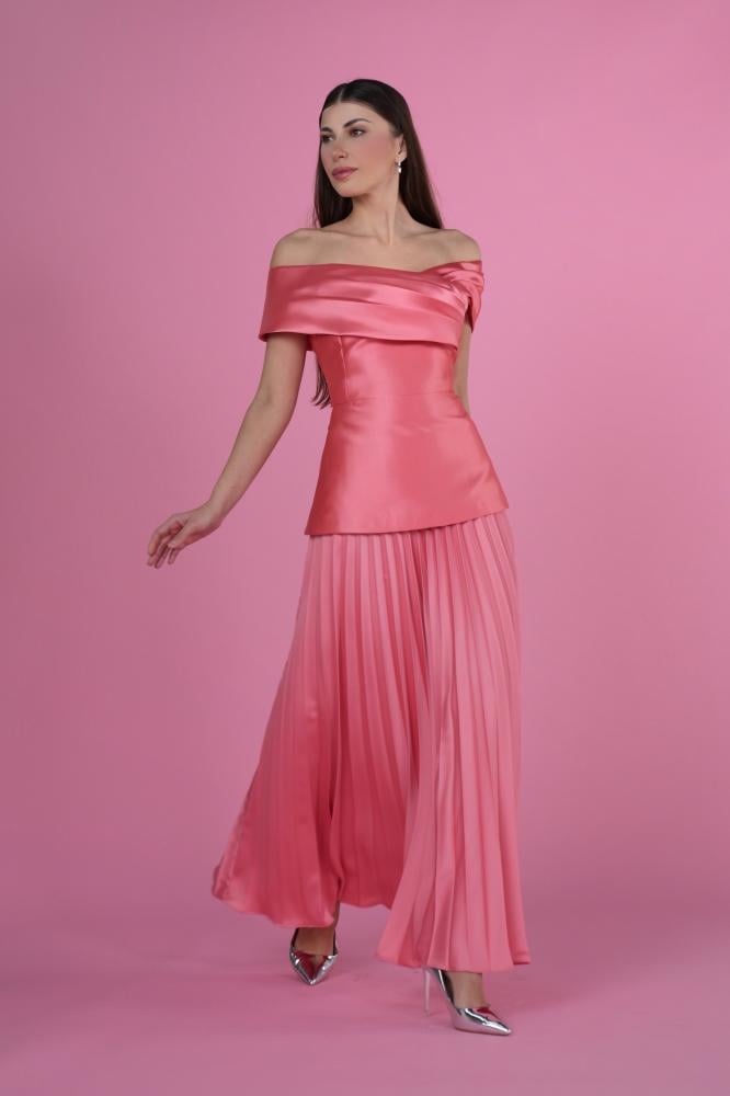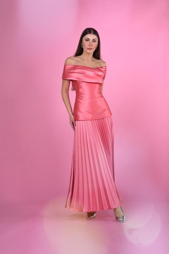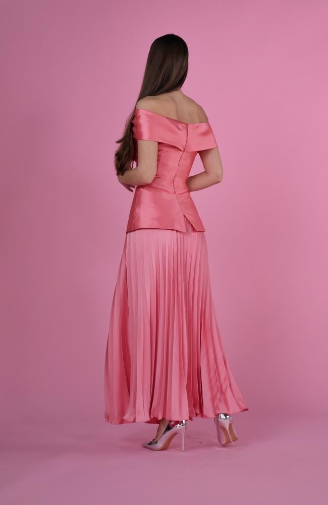 Get this two-piece women's tee set and ensure an elegant look for special occasions. It features an off-the-shoulder blouse with a soft, feminine cut at the bust, and a pleated skirt that ensures comfort and flexibility.