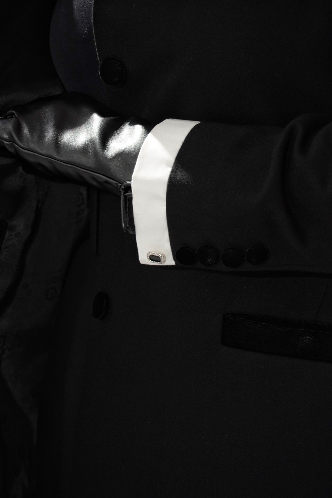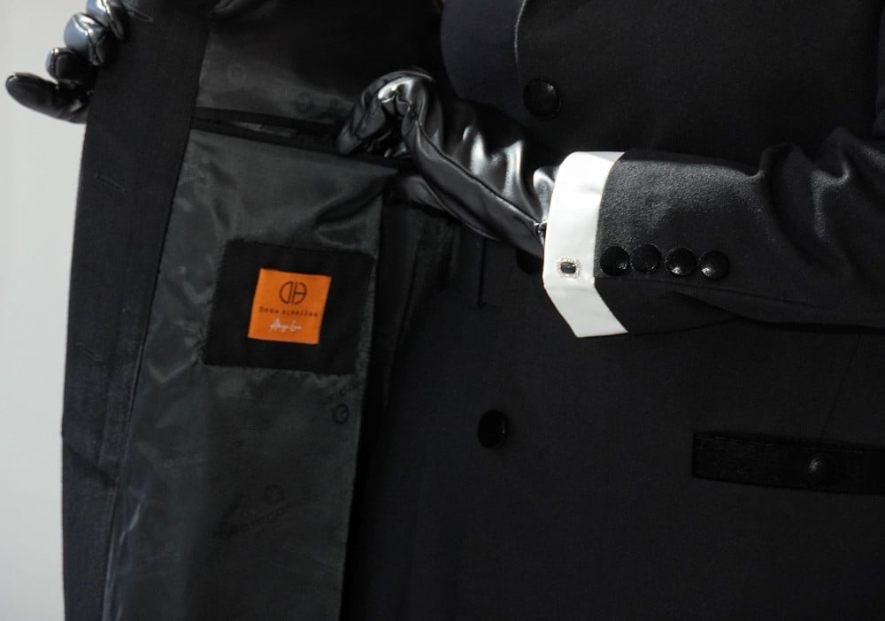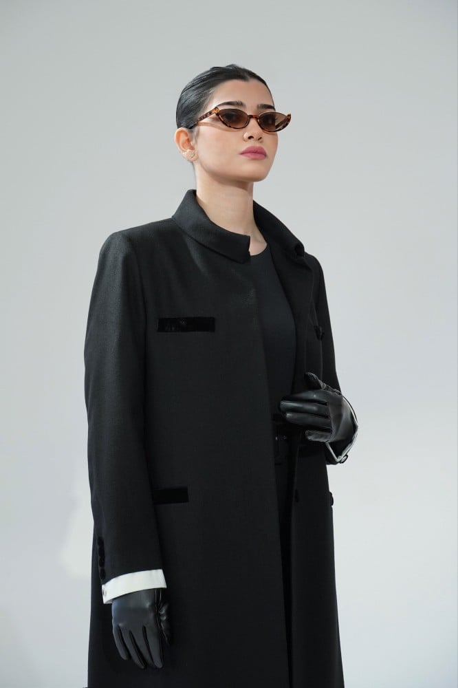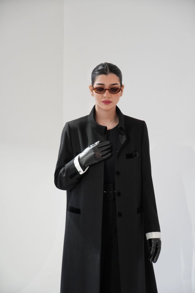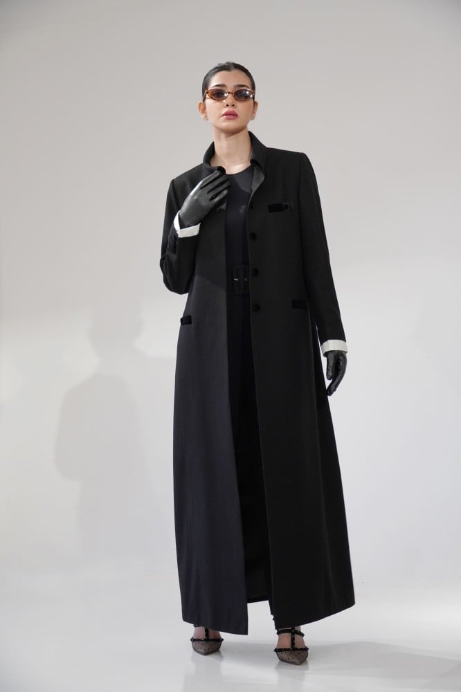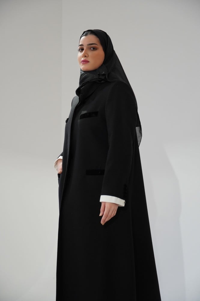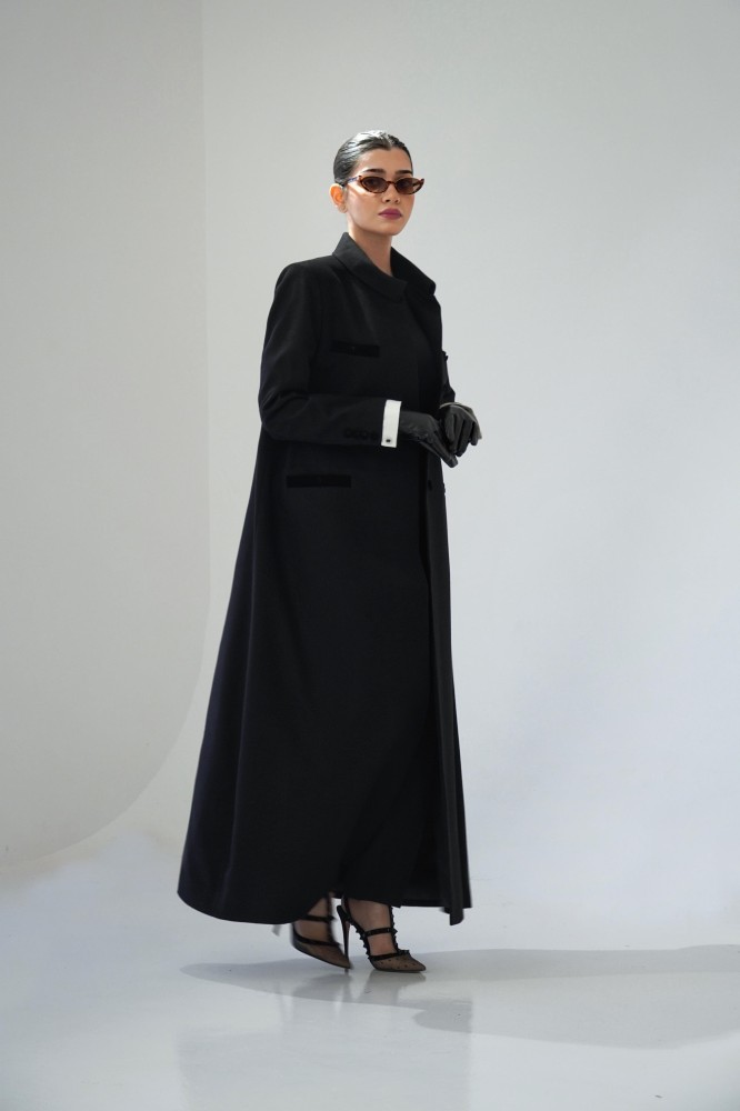 - Black luxurious wool coat abaya, fully lined with black velvet touches on the front pockets and buttons.