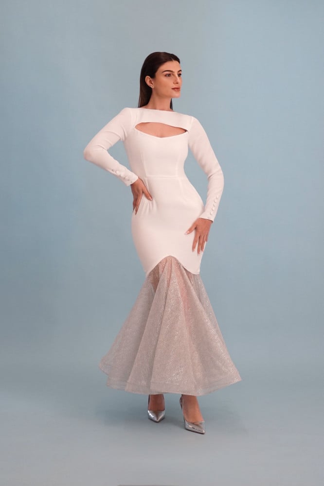 Now you can get a soft, long, white dress, perfect for evening parties and special occasions. It features a unique design that combines modernity and elegance, with a bold touch at the top, in the form of a slit in the chest area, closed at the neck. The bottom is decorated with multi-layered silver tulle, adding a unique, contemporary touch to the look.